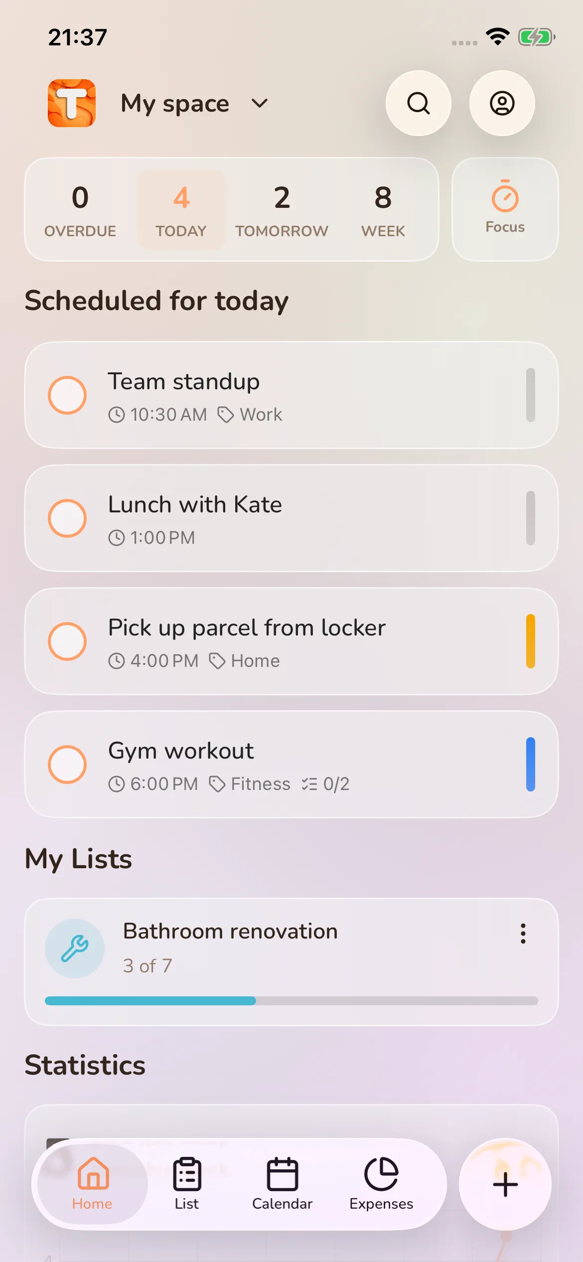 Yes - calendar, lists, expenses, Pomodoro, widgets and themes are all free, with no ads. The Free plan includes 1 board for 2 people and 5 lists. If you need more, Pro gives you up to 10 boards, 20 people and features like recurring tasks, calendar sync or export.